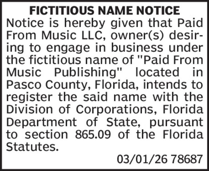 FICTITIOUS NAME NOTICENotice is hereby given that NextPath Career Partners, Inc., owner desiring to engage in business under the fictitious name of “NextPath Workforce Solutions” located in Hillsbo...