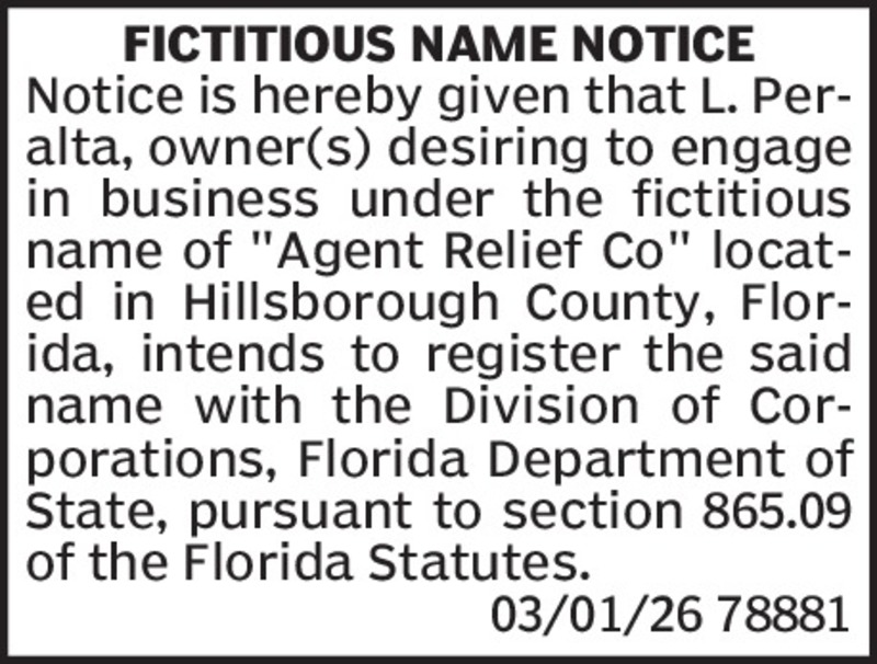 NOTICE UNDER FICTITIOUS NAME LAW PURSUANT TO SECTION 865.09, FLORIDA STATUTESNOTICE IS HEREBY GIVEN that the undersigned, desiring to engage in business under the Fictitious Name of “Palms At Westc...