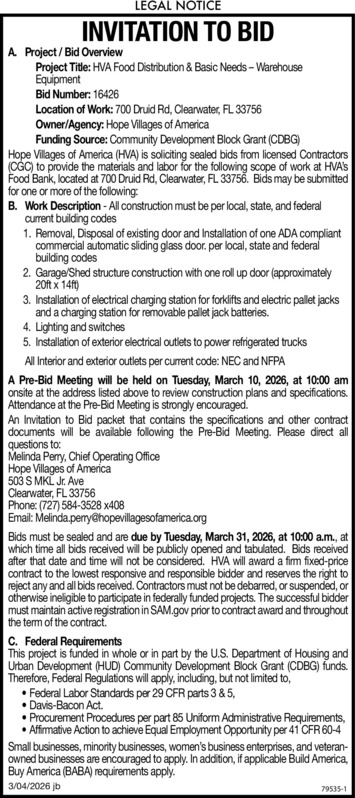NOTICE OF PUBLIC SALEThe following personal property of Paul Hervieux and/or Annette Hervieux will, on March, 18, 2026, at 10:00 am, at 9925 Ulmerton Road, Lot 178, Oakcrest/Acorn MHC, Largo, Pinel...