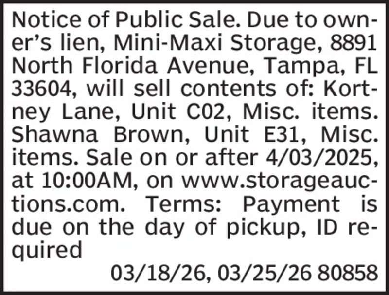 NOTICE OF AUCTIONAuction date: 03/25/2026 @10amLocation: J&M Storage 28363 Cortez Blvd. Brooksville, Fl. 34602JACQUELINE JONESUnit #01310x20Misc. Household goods03/15, 03/22, 2026 81548