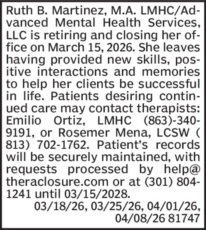 NOTICE OF AUCTIONAuction date: 03/25/2026 @10amLocation: J&M Storage 28363 Cortez Blvd. Brooksville, Fl. 34602JACQUELINE JONESUnit #01310x20Misc. Household goods03/15, 03/22, 2026 81548