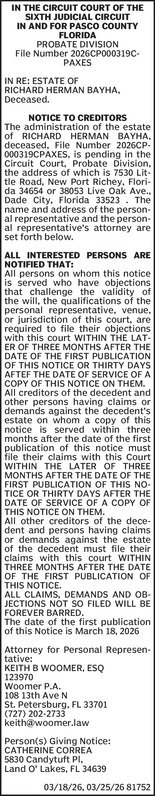 IN THE CIRCUIT COURT FOR PASCO COUNTY, FLORIDA PROBATE DIVISION File No. 25-CP-1275-WS Division __________ IN RE: ESTATE OF KEVIN STEPHEN BARTLETT a/k/a KEVIN S. BARTLETT ...