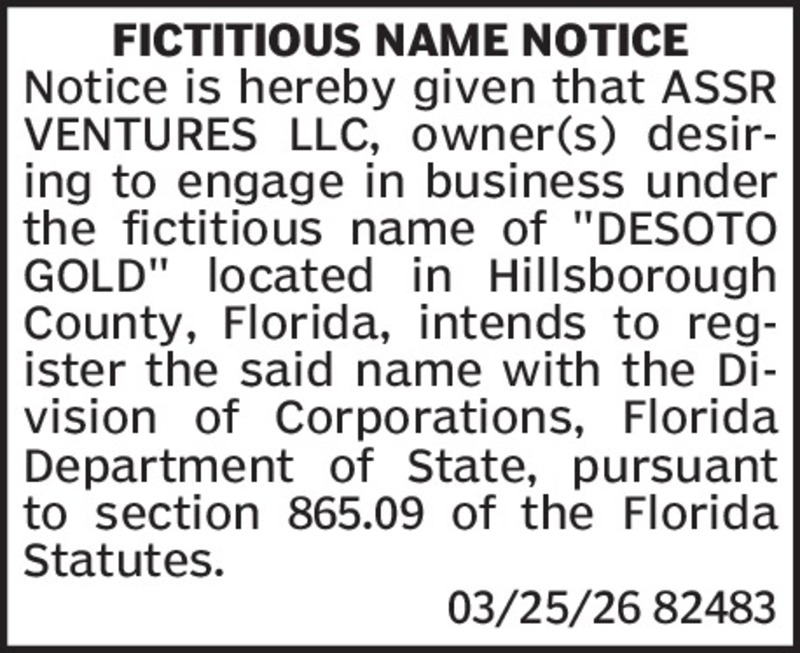 NOTICE UNDER FICTITIOUS NAME LAW PURSUANT TO SECTION 865.09, FLORIDA STATUTES NOTICE IS HEREBY GIVEN that the undersigned, desiring to engage in business under the Fictitious Name of Service Painti... Show more »