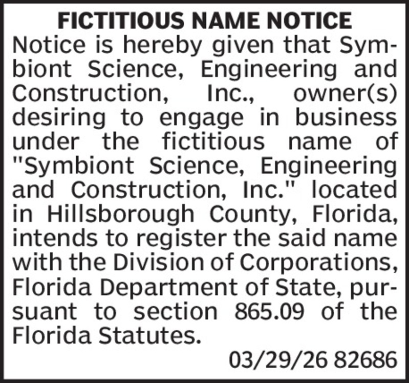 Fictitious Name NoticeNotice is hereby given that Henry produce, desiring to engage in business under the fictitious name Little Sisters Blend located at 6806 Pearson Ln, Wesley Chapel FL 33544, in...
