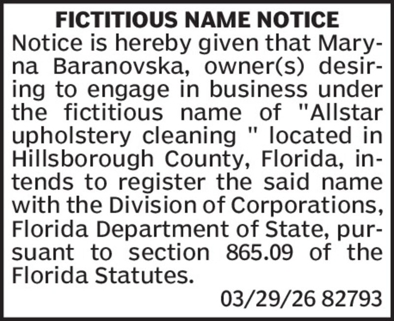 Fictitious Name NoticeNotice is hereby given that Henry produce, desiring to engage in business under the fictitious name Little Sisters Blend located at 6806 Pearson Ln, Wesley Chapel FL 33544, in...