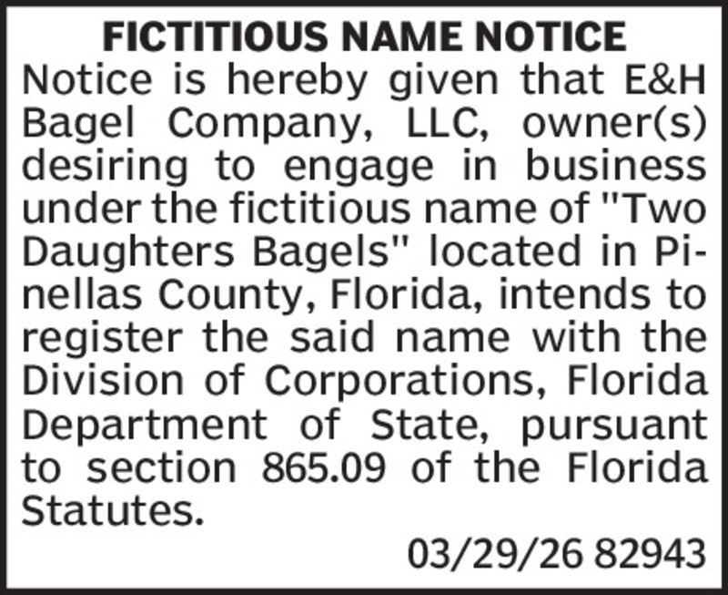 FICTITIOUS NAME NOTICENotice is hereby given that Namaste Construction, LLC, owner, desiring to engage in business under the fictitious name of “Namaste Homes” located in Pinellas County, Florida, ...