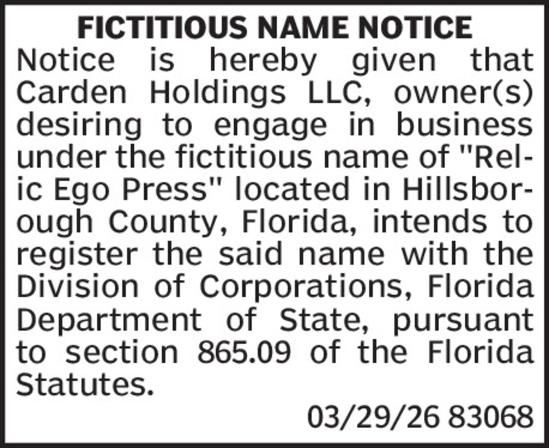 Fictitious Name NoticeNotice is hereby given that Henry produce, desiring to engage in business under the fictitious name Little Sisters Blend located at 6806 Pearson Ln, Wesley Chapel FL 33544, in...