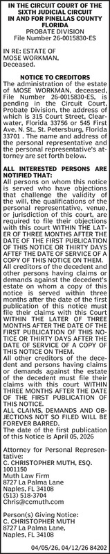 IN THE CIRCUIT COURT FOR HERNANDO COUNTY,FLORIDA PROBATE DIVISIONFile No. 2026-CP-0303Division IN RE: ESTATE OF CHARLES LEE CAPARELLA A/K/A CHARLES L. CAPARELLA Deceased. NO... Show more »