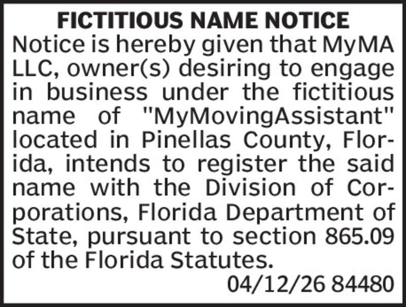 Fictitious Name NoticeNotice is hereby given that Server Baba Inc, owner, desiring to engage in business under the fictitious name of BizRethink AI, located at 29090 Picana Lane, Wesley Chapel, FL ...