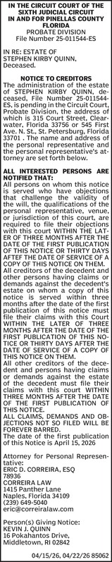 IN THE CIRCUIT COURT FOR CITRUS COUNTY, FLORIDAPROBATE DIVISIONFile No.: 2025-CP-856 IN RE: ESTATE OF ROBERT GEORGE PAVIN, SR. A/K/A ROBERT G. PAVIN, Deceased. NOTICE TO CREDITORS The adminis... Show more »