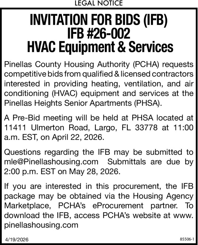 Sealed Proposal Packages for BID 2026-009 Janitorial Supplies will be received by Chad Chronister, Sheriff, at 2008 East 8th Avenue, Tampa, Florida, 33605. Proposals must be received by May 22, 20...