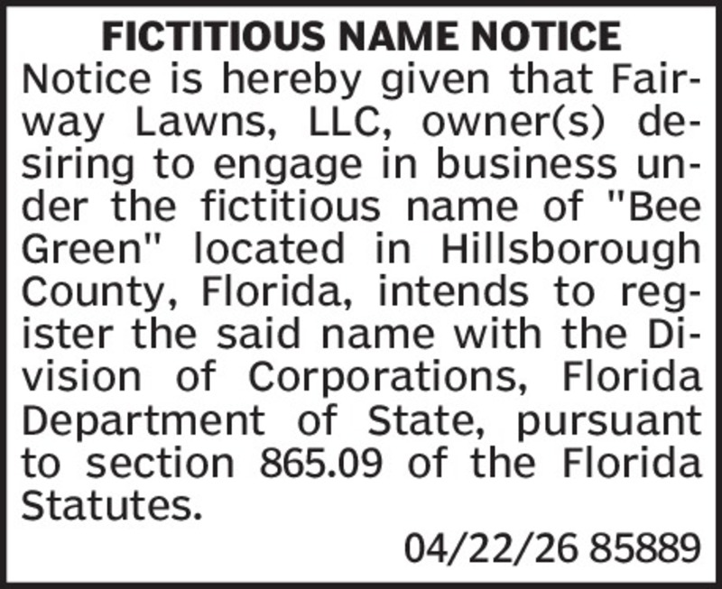 NOTICE UNDER FICTITIOUS NAME LAW PURSUANT TO SECTION 865.09, FLORIDA STATUTES NOTICE IS HEREBY GIVEN that the undersigned, desiring to engage in business under the Fictitious Name of DRS Laurel Tec... Show more »