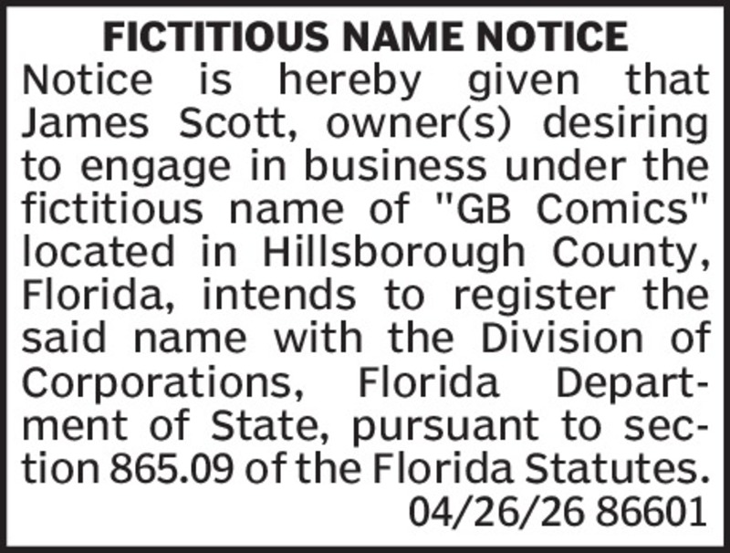 Fictitious Name NoticeNotice is hereby given that Pulse Health, PLLC, desiring to engage in business under the fictitious name Valence Health located at 735 Arlington Ave N, St. Petersburg, FL 3370... Show more »