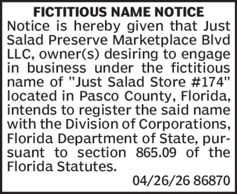 Fictitious Name NoticeNotice is hereby given that Pulse Health, PLLC, desiring to engage in business under the fictitious name Valence Health located at 735 Arlington Ave N, St. Petersburg, FL 3370...