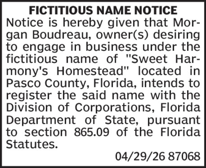 Fictitious Name NoticeNotice is hereby given that Abacus Financial US Inc, desiring to engage in business under the fictitious name getyourmortgagehere.com located at 3915 Floramar Ter, New Port Ri...